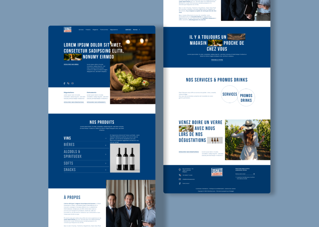 Distriboissons est une entreprise active dans le secteur de la distribution de boissons auprès des particuliers et des professionnels. Son site web actuel étant devenu obsolète, la mission consistait à concevoir une plateforme entièrement modernisée, plus intuitive et en phase avec son identité de marque.